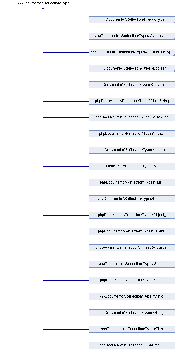 Implemented in phpDocumentor\Reflection\Types\AggregatedType, phpDocumentor\Reflection\Types\AbstractList, phpDocumentor\Reflection\Types\Object_, phpDocumentor\Reflection\Types\Collection, phpDocumentor\Reflection\Types\ClassString, phpDocumentor\Reflection\Types\Expression, phpDocumentor\Reflection\Types\Nullable, phpDocumentor\Reflection\Types\Static_, phpDocumentor\Reflection\PseudoTypes\False_, phpDocumentor\Reflection\PseudoTypes\True_, phpDocumentor\Reflection\Types\This, phpDocumentor\Reflection\Types\Void_, phpDocumentor\Reflection\Types\Parent_, phpDocumentor\Reflection\Types\Self_, phpDocumentor\Reflection\Types\Boolean, phpDocumentor\Reflection\Types\Callable_, phpDocumentor\Reflection\Types\Float_, phpDocumentor\Reflection\Types\Integer, phpDocumentor\Reflection\Types\Mixed_, phpDocumentor\Reflection\Types\Null_, phpDocumentor\Reflection\Types\Resource_, phpDocumentor\Reflection\Types\Scalar, phpDocumentor\Reflection\Types\String_, and phpDocumentor\Reflection\Types\Iterable_.